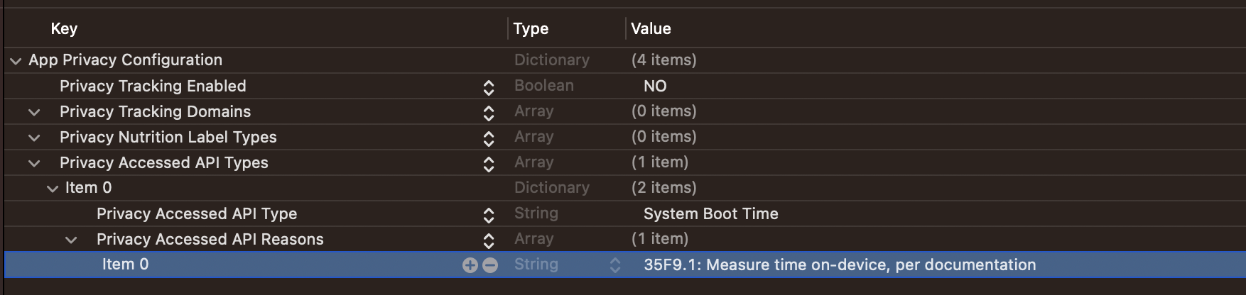 - 다 열어보면 아래쪽에 Privacy Accesed API Types 안의 value값을 보면, System Boot Time을 사용하고 on-device의 시간을 측정한다는 값이 존재