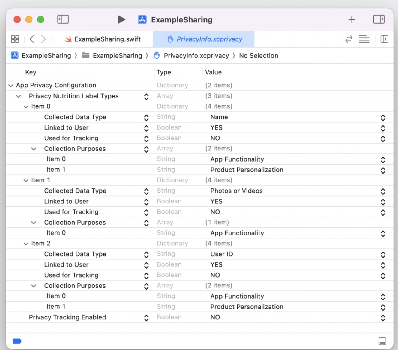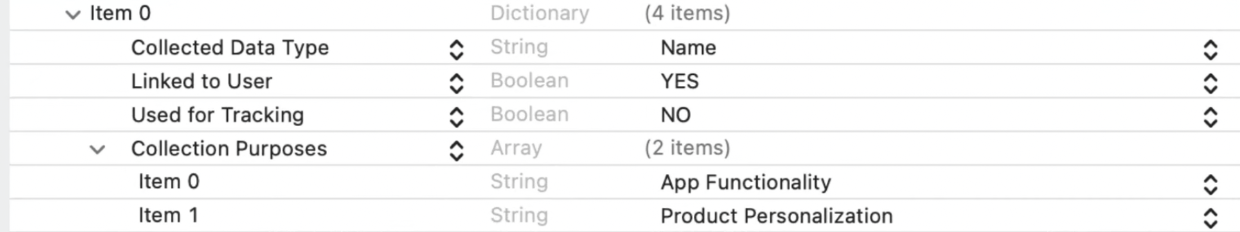 - NSPrivacyCollectedDataTypePurposes: Array 타입
