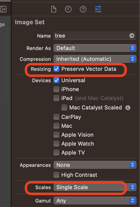 - Asset파일에서 vector 이미지에 관한 single scale과 vector data 설정을 아래처럼 시도하면, 이후에는 XCode내부에서 스케일을 자동으로 조절해준다는 의미