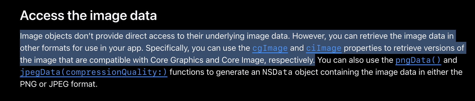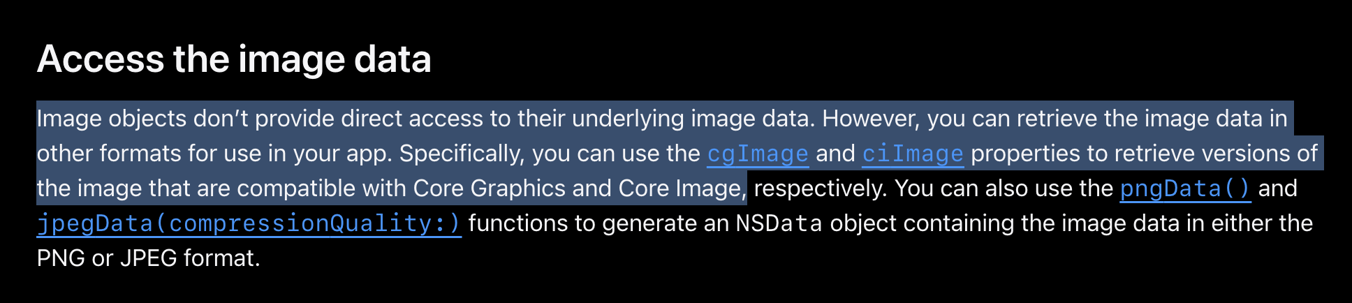 - 실제로 UIImage의 개발 문서를 보면 UIImage는 이미지 데이터의 저수준 레벨에 있는 데이터를 직접적으로 접근하는 인터페이스를 숨기고 CGImage나 CIIMage로 접근해야지 사용이 가능