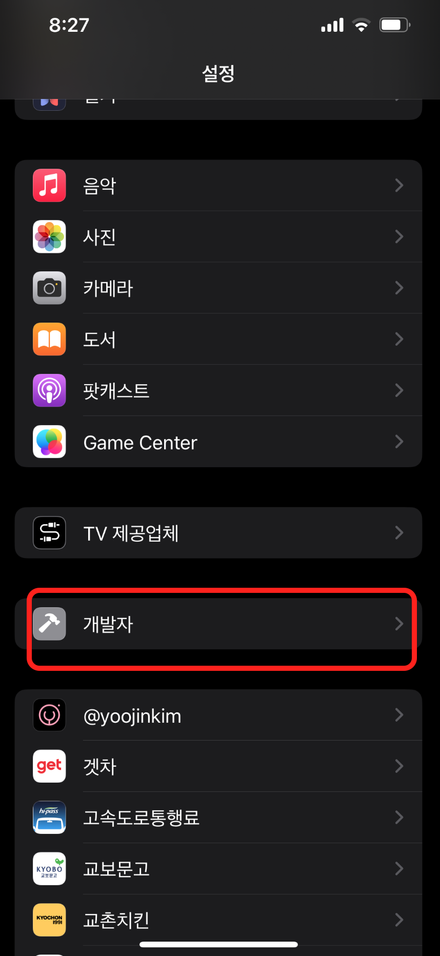 - 주의2) 아이폰 OS에 따라서 개발자 메뉴가 설정키면 바로 보이는것도 있고, 설정 > 개인정보 보호 및 보안 메뉴 안에 개발자 메뉴가 있는 경우도 있음
