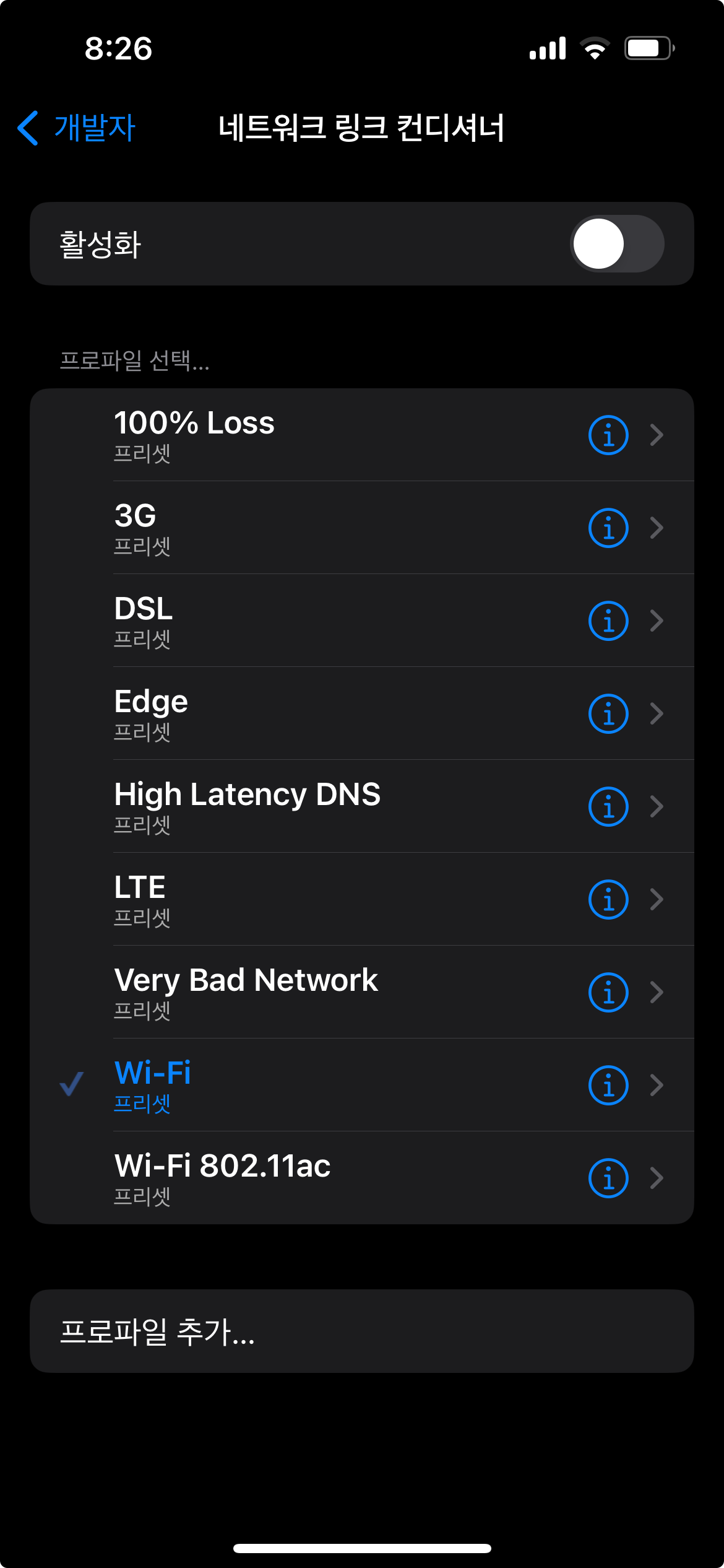 - Very Bad Network: 극도로 낮은 속도와 높은 지연 시간, 그리고 패킷 손실을 포함한 상태를 테스트 (최악의 네트워크 조건에서도 앱이 어떻게 작동하는지 확인)