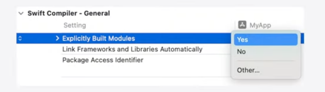 - 이 설정은 Xcode에서 Explicitly Built Modules 플래그를 Yes로 설정하면 활성화됨