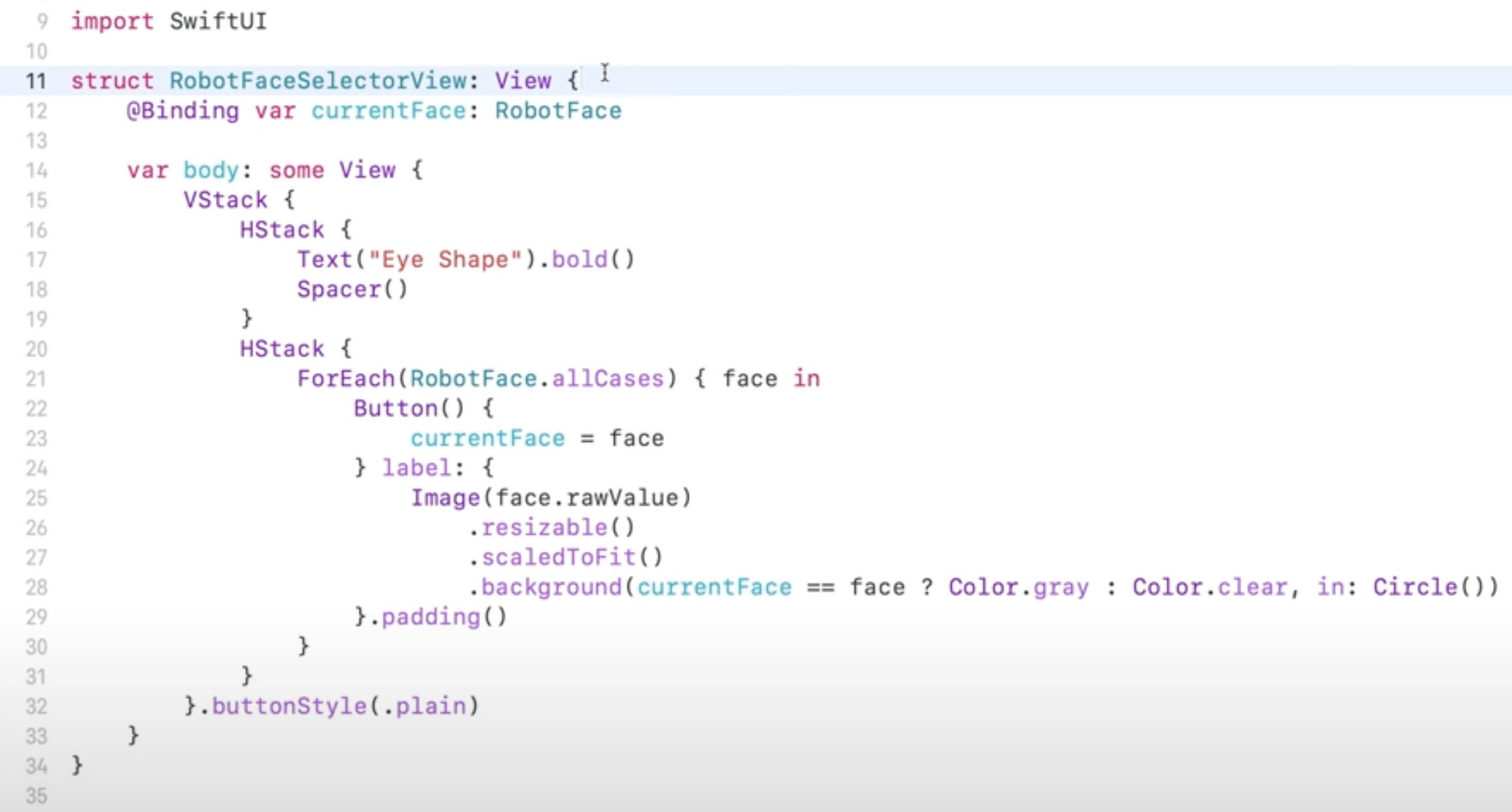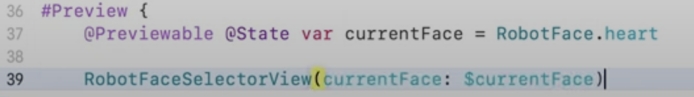 - 아래와 같은 RobotFaceSelectorView를 프리뷰 사용할 때 currentFace에 관한 바인딩이 필요한 상황