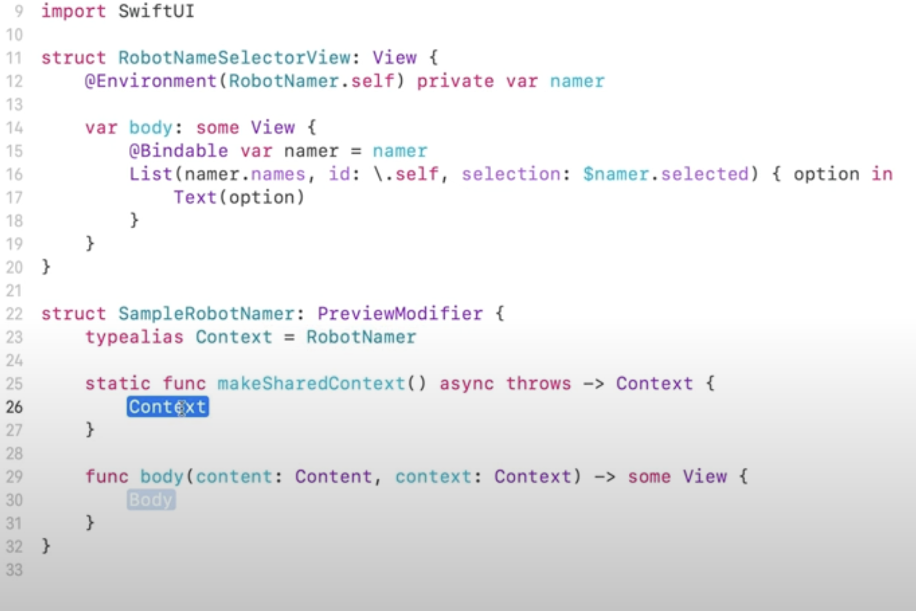ex) RobotNamer라는 구조체에 PreviewModifier를 준수