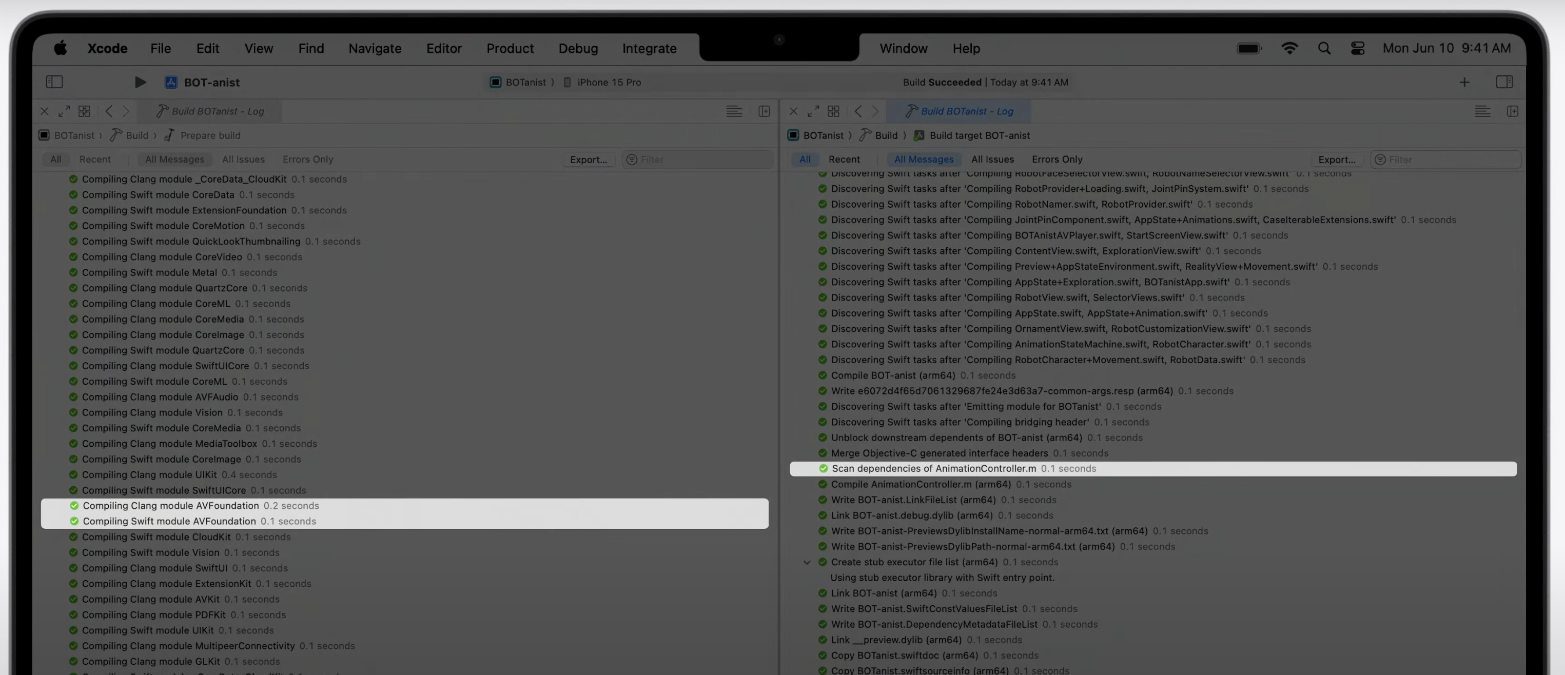 - "Scan Dependency", "Compile Clang module", "Compile Swift module" 커멘드로 표출