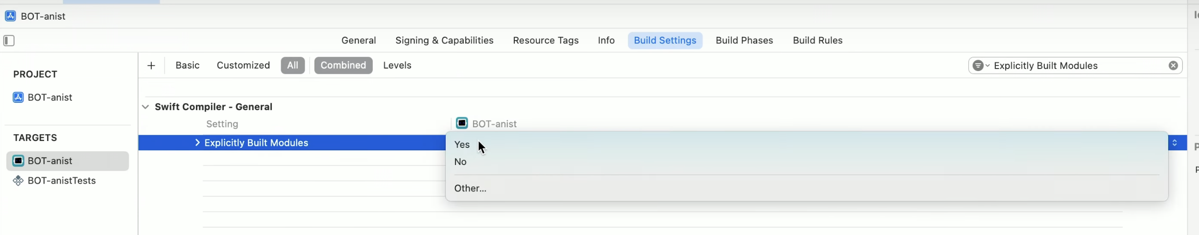 - C와 Objective-C의 경우에는 Explicit Modules 기능이 디폴트로 on 되어있고, Swift는 build setting에서 설정 필요