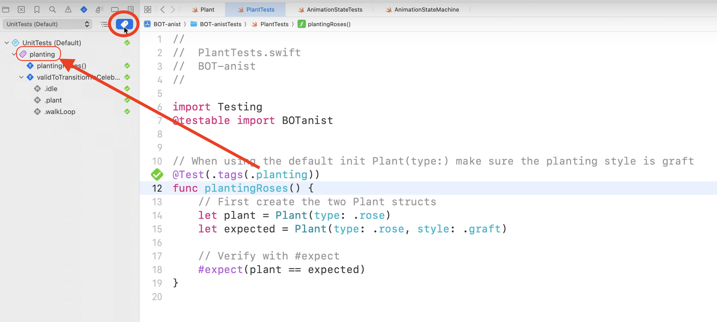 - Xcode에서 tags버튼을 클릭하여 그룹화된 테스팅 확인이 가능