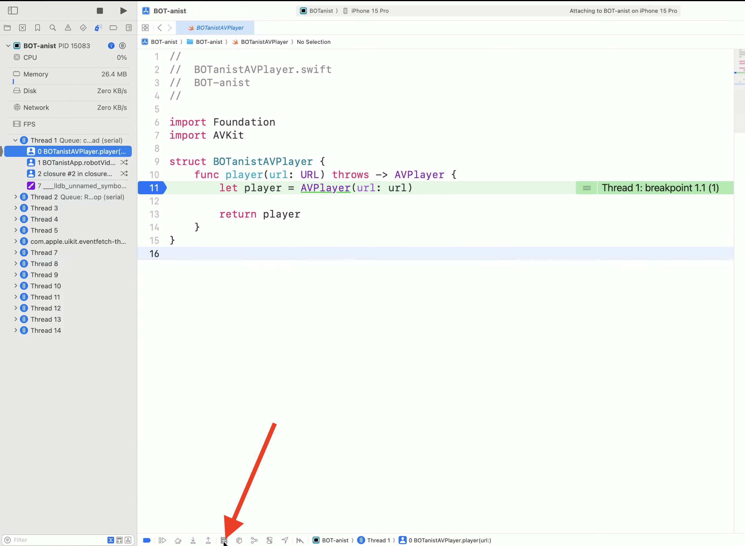 - 브레이크 포인트를 잡고, Xcode하단에 stack으로 쌓인 아이콘 클릭