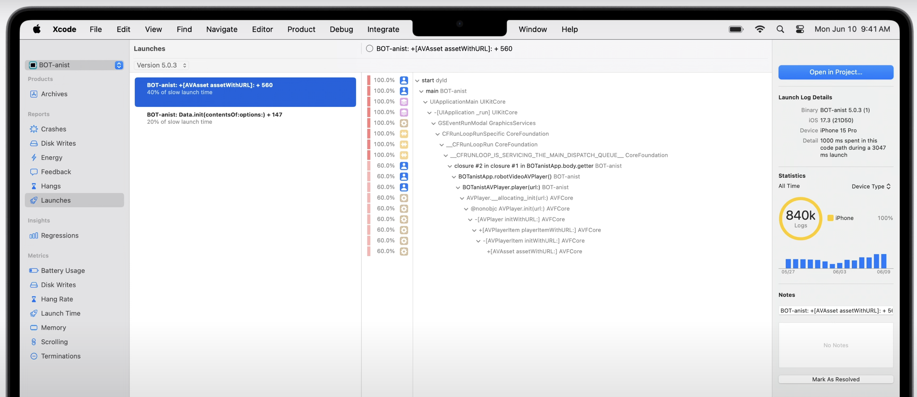 - Xcode의 Organizer에 새로운 앱 구동에 대한 새로운 분석 카테고리가 생성