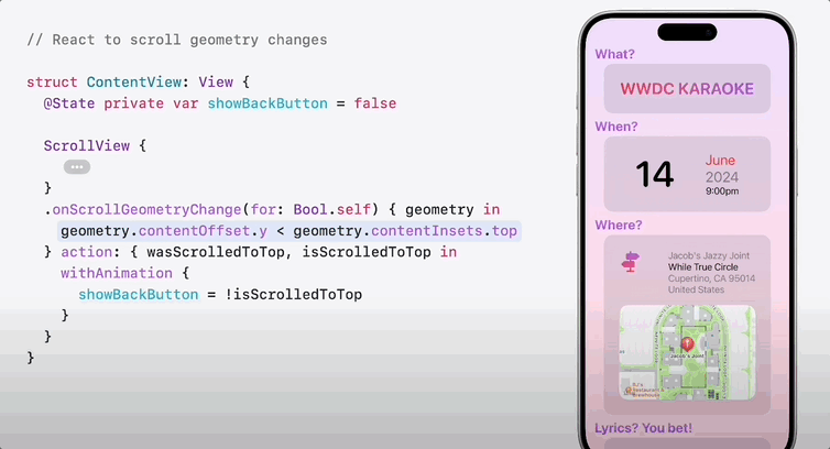 ex) onScrollGeometryChange를 사용하여, contentOffset.y값이 contentInsets.top보다 작을 때 스크롤이 아래로 조금 내려갈때 backButton을 상단에 노출하는 UI