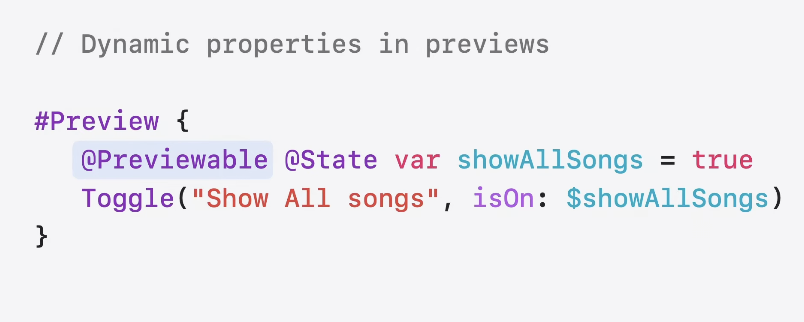 - dynamic properties에 관해서 Preview를 사용하고 싶을때 @State에 관한 wrapper를 만들 필요 없이, @Previewable을 사용하면 바로 preview사용이 가능