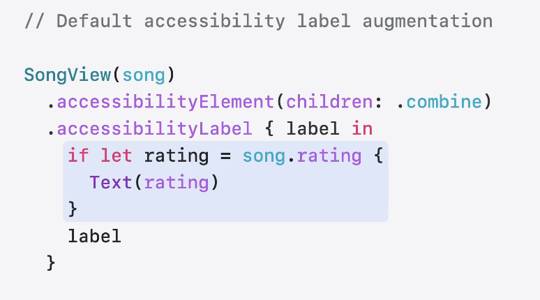 - 이 외의 SwiftUI에 관한 accessibilityLabel 관련 새로운 기능은 Catch up on accessibility in SwiftUI WWDC24 참고