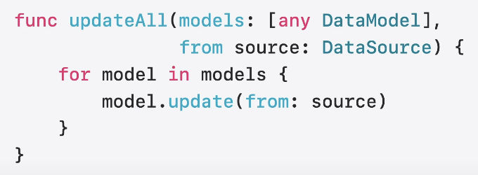 func updateAll (models: [any DataModel], from source: DataSource) {