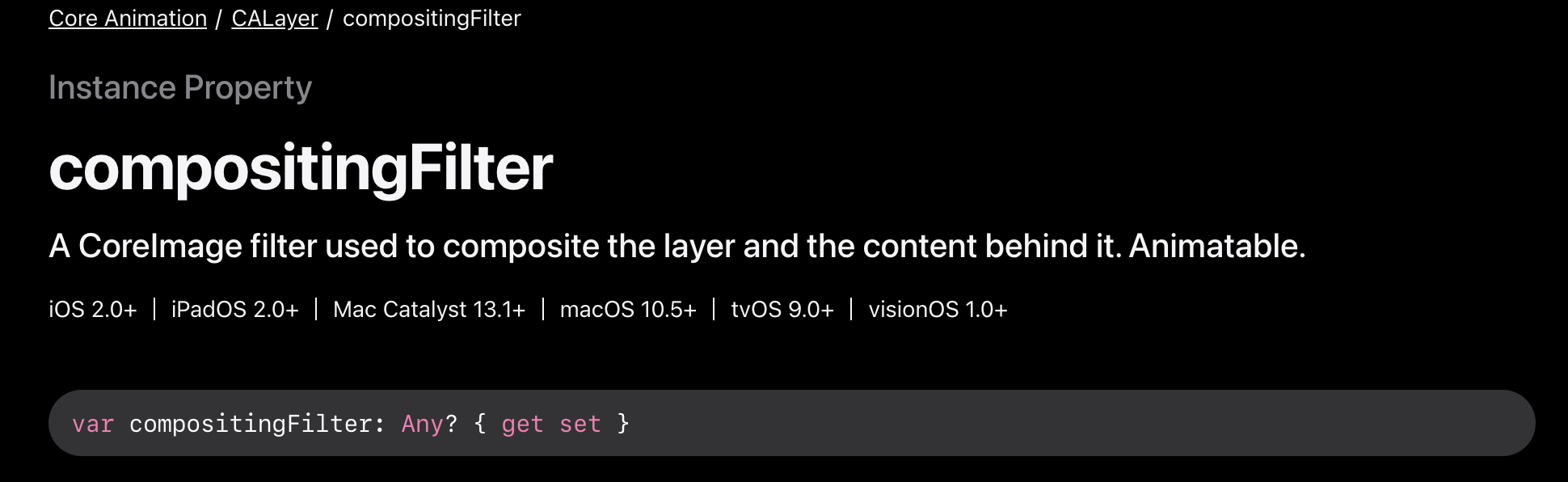 - 이 밖에도 compositingFilter에는 여러가지 값을 사용할 수 있는데, 이 값은 애플 문서 참고