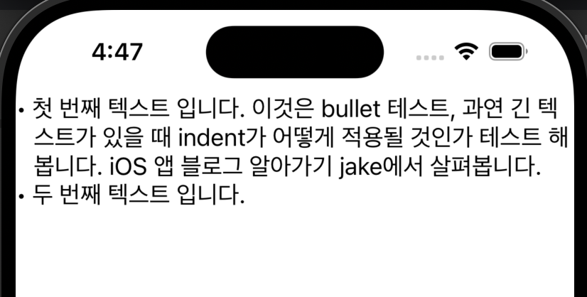 • 첫 번째 텍스트 이빈다. 이것은 bullet 테스트, 과연 긴 텍스트가 있을 때 indent가 어떻게 적용될 것인가 테스트 해봅니다. iOS 앱 블로그 알아가기 jake에서 살펴봅니다.