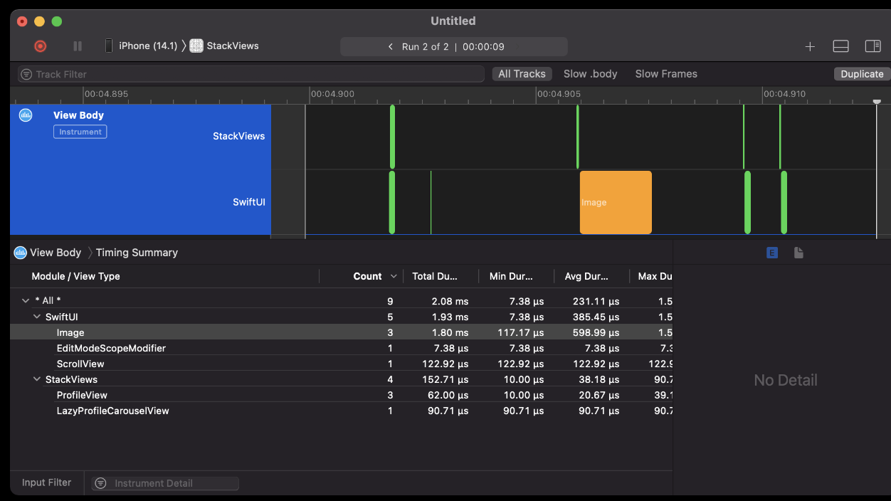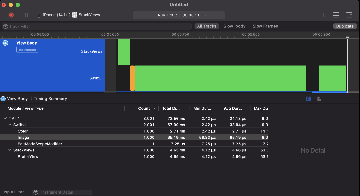 - 1000개의 ProfileView를 HStack과 LazyHStack으로 각각 실행해보고 Xcode profile을 사용하여 속도 분석