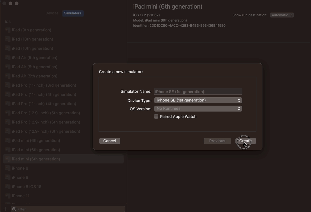 [iOS - swift] Xcode에서 시뮬레이터가 보이지 않을 때 설정 방법 (iPhone SE1 시뮬레이터 실행 방법, could not create iPhone SE...) 본문