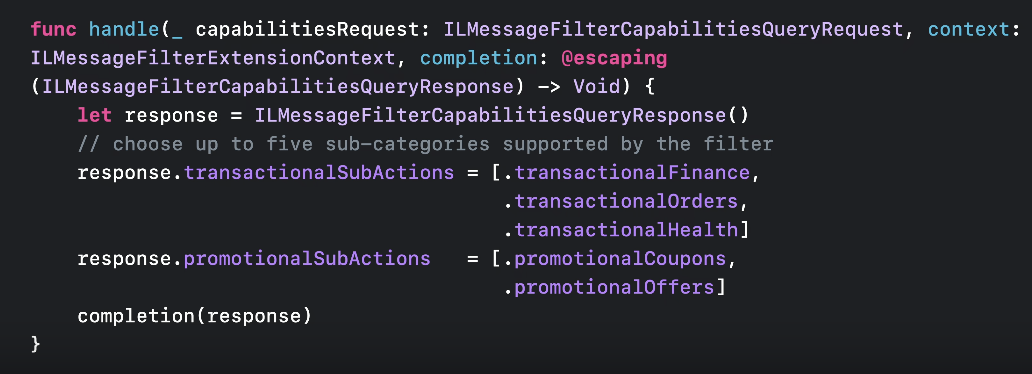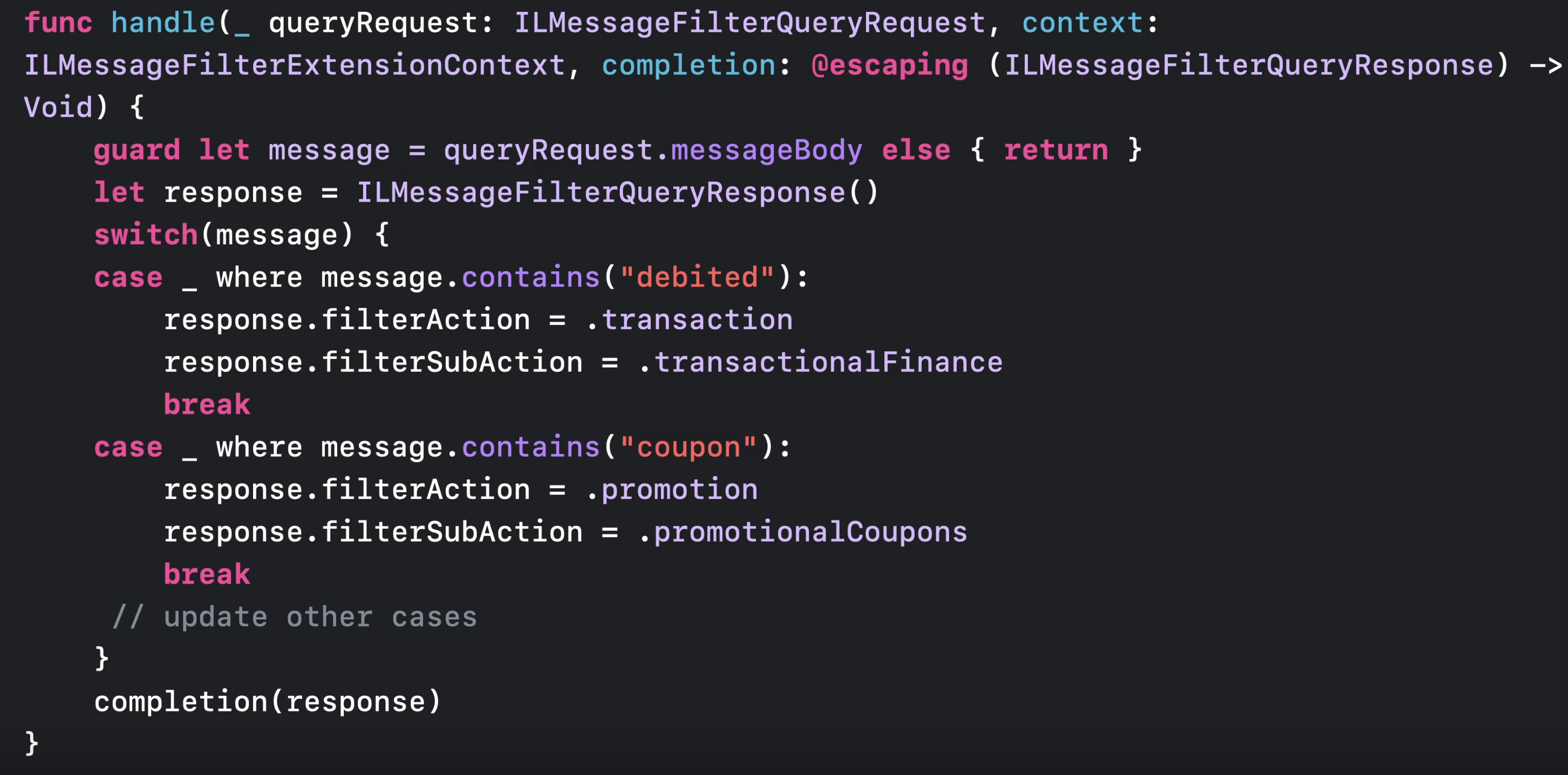 - MessageFilterExtension.swift에서 handle에 message를 가로채서 구문을 분석하여 아래처럼 분류가 가능