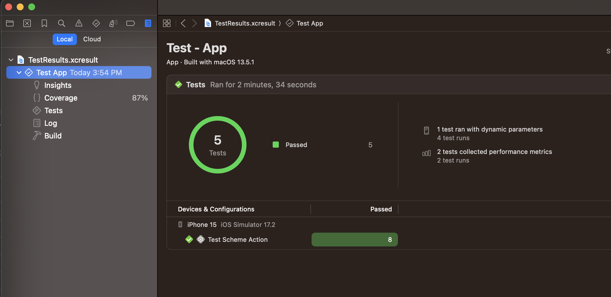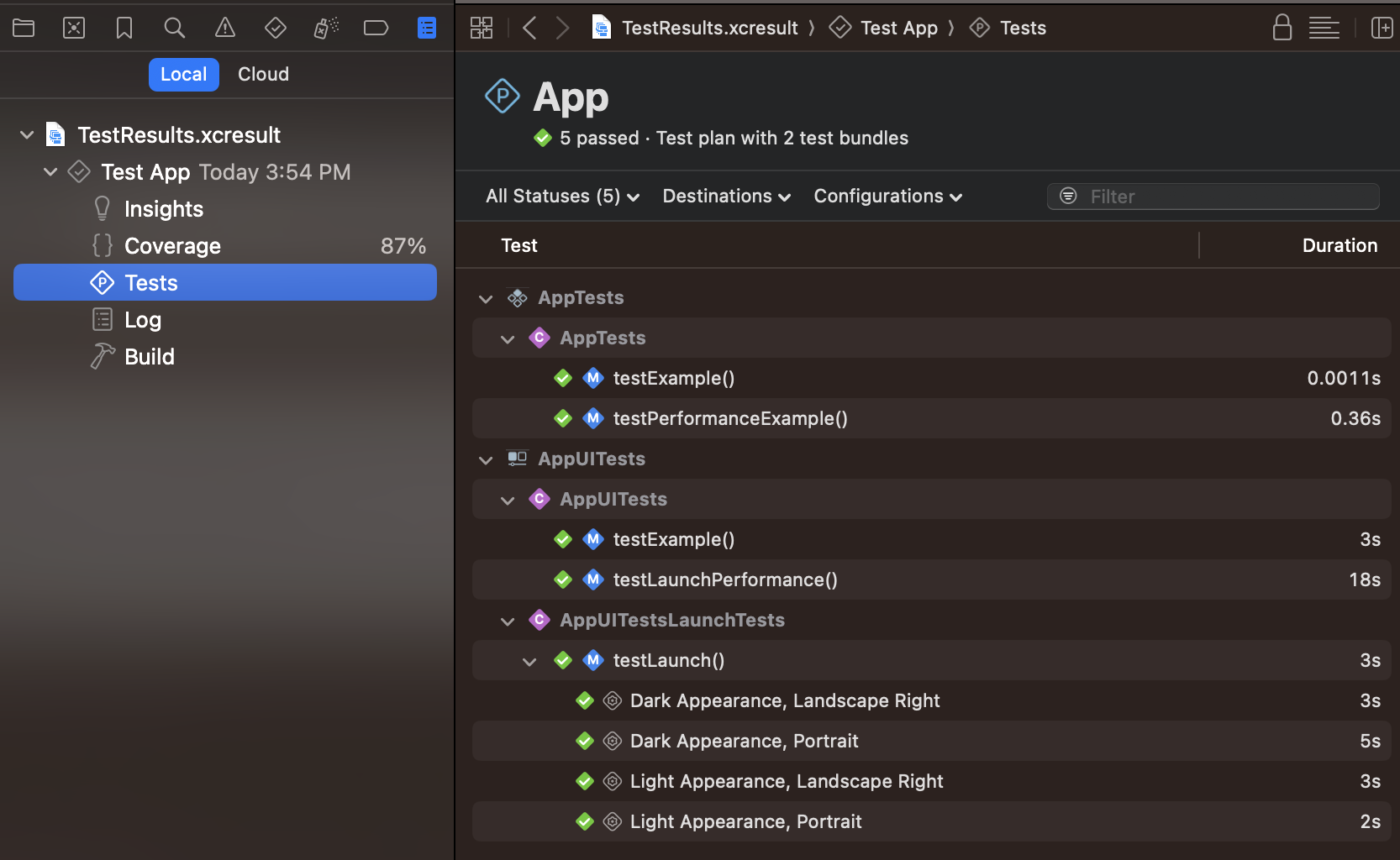 - 왼쪽 탭에는 Test App, Insights, Coverage, Tests, Log, Build가 존재