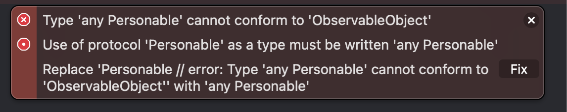 // error: Type 'any Personable' cannot conform to 'ObservableObject'