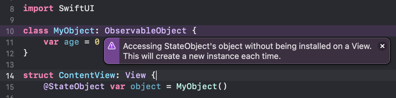 - @StateObject를 선언된 곳 외부에서 호출하면 해당 뷰 라이프사이클 외부에서 호출한 것이므로 경고 메시지가 표출되는 것