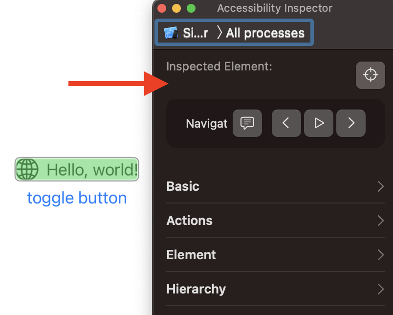 - 지구본 이미지와 텍스트가 하나로 묶였고, "Hello, world!"라고 Text의 접근성 값도 자동으로 적용됨