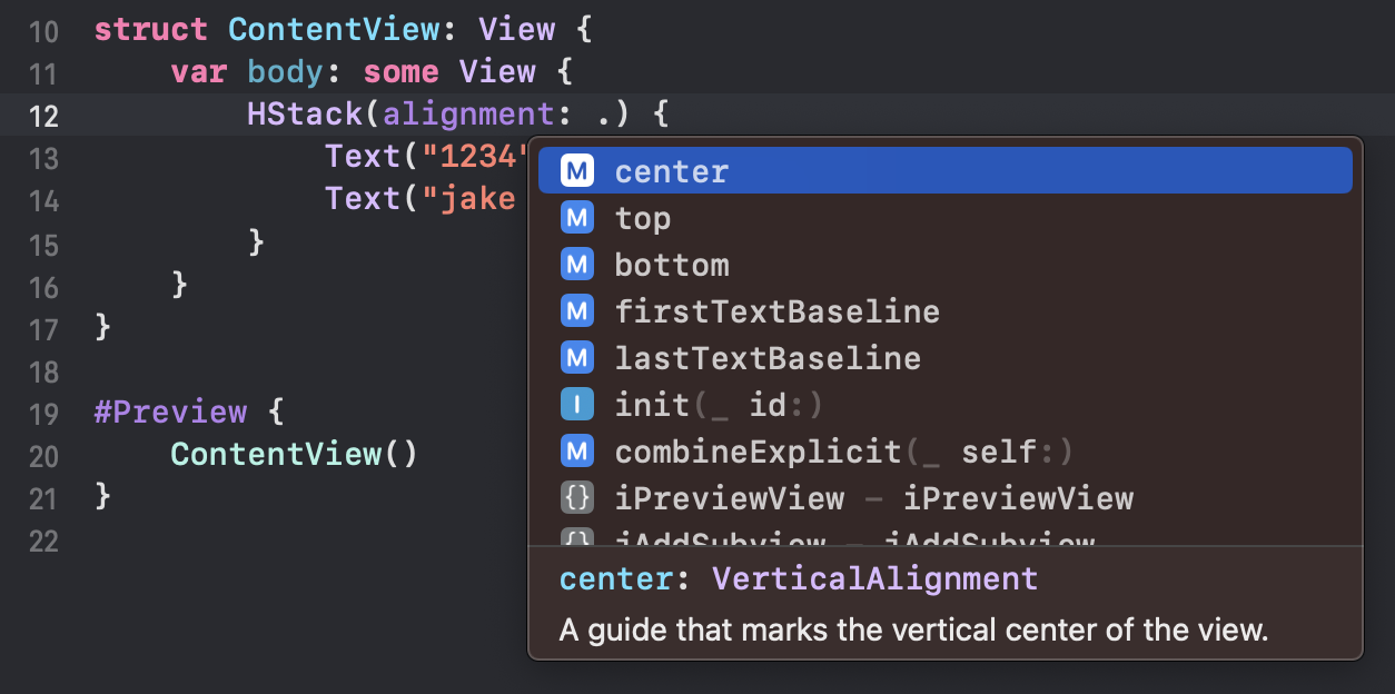 - 보통 HStack, VStack을 사용하다보면 alignment 값이 있는데 대부분은 default(.center)로 두고 사용하지만 이 값을 잘 사용하면 다양한 뷰 배치를 편리하게 할 수 있는 장점이 존재