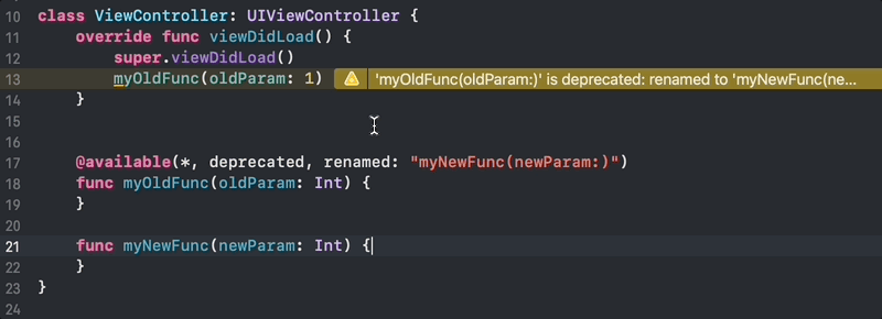 @available(*, deprecated, renamed: "myNewFunc(newParam:)")
