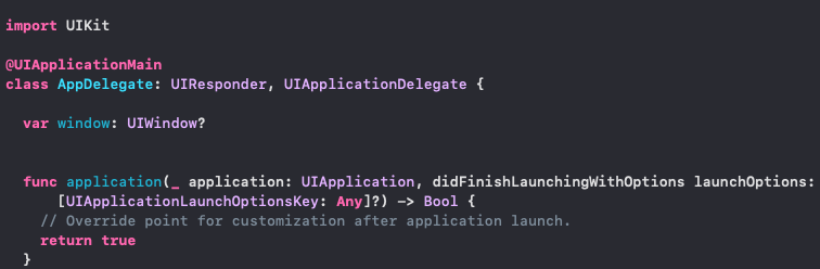 - UIApplication은 앱 그 자체(생성한 객체, 앱의 기능 모두 이곳에 포함되어 있는 하위 객체)