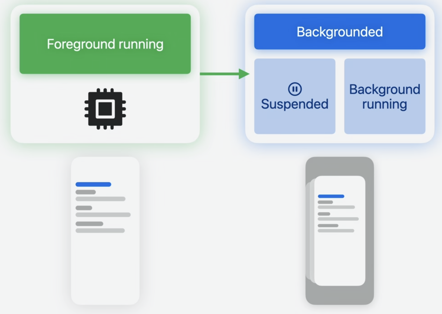 - 애플이 백그라운드 상태를 만드는 목적의 핵심은 `배터리 수명`을 보호하고 `성능을 최적화`하여 부드럽고 반응성 있는 사용 경험을 유지하는 것