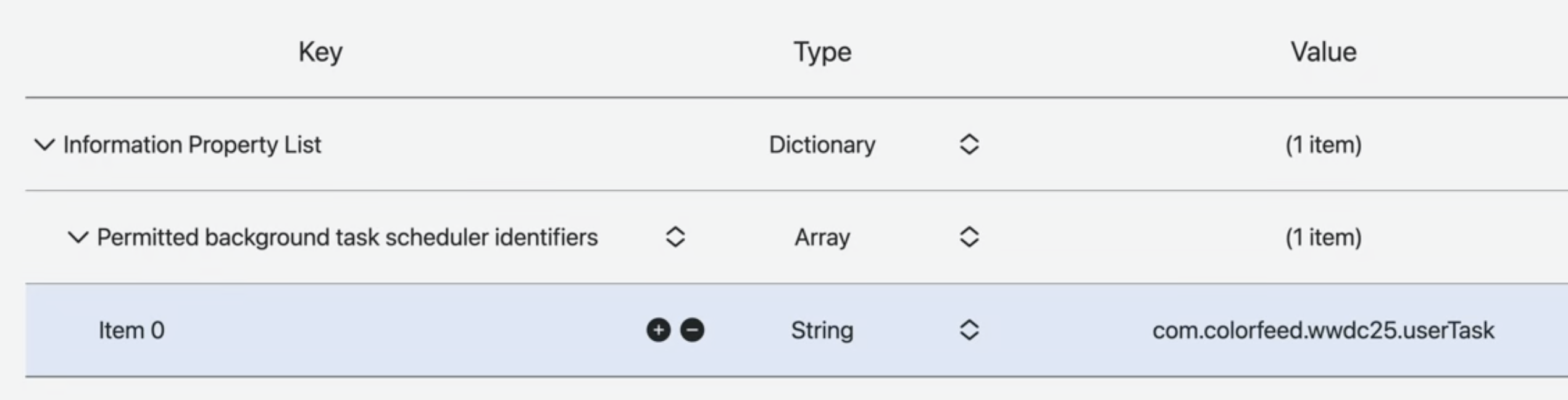 - Permitted background task scheduler identifiers 키 값으로 value에는 앱 bundle id로 추가