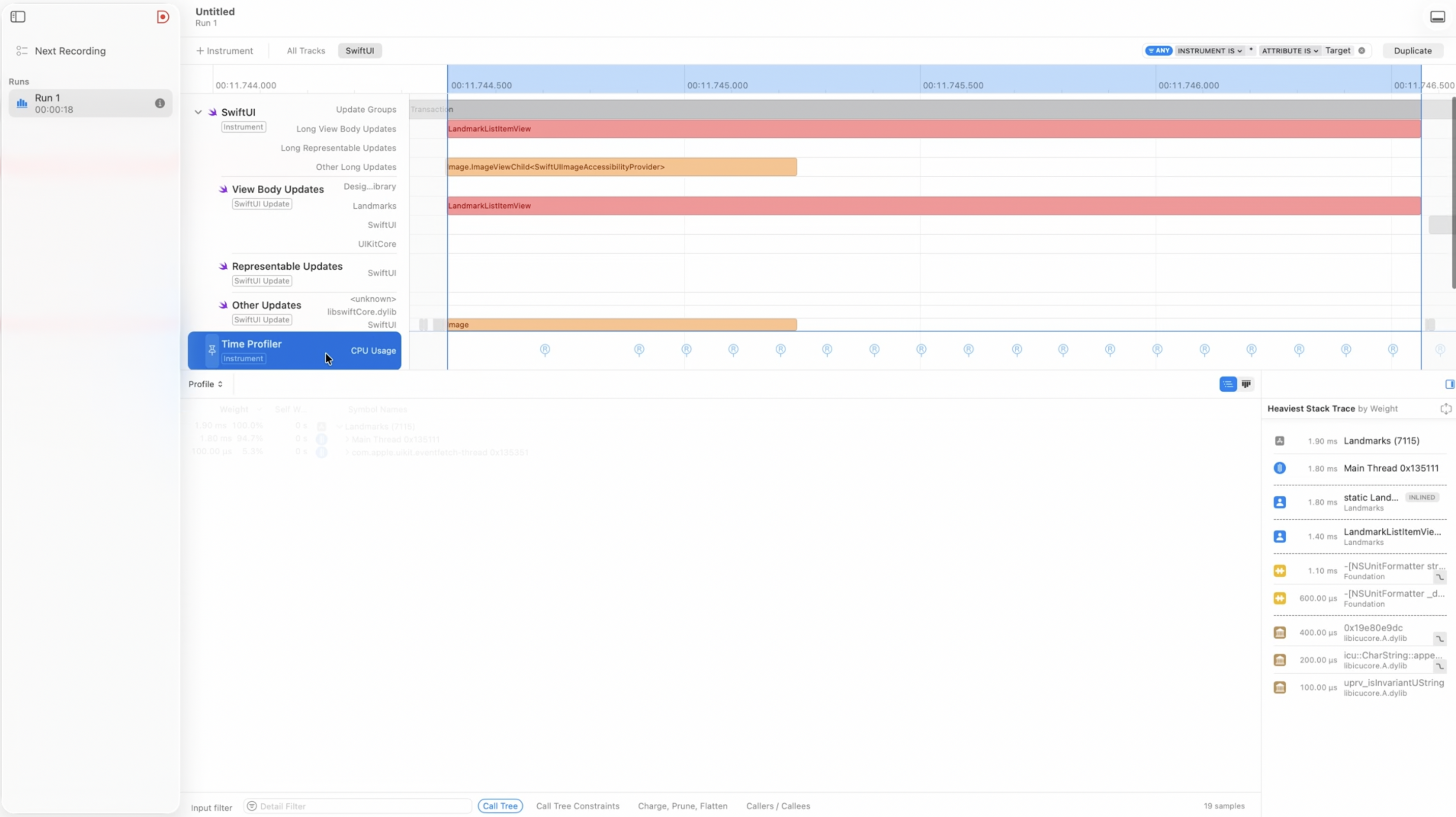 - Time Profiler는 정기적으로 샘플을 추출하여 현재 실행중인 함수에 대한 분석을 시도