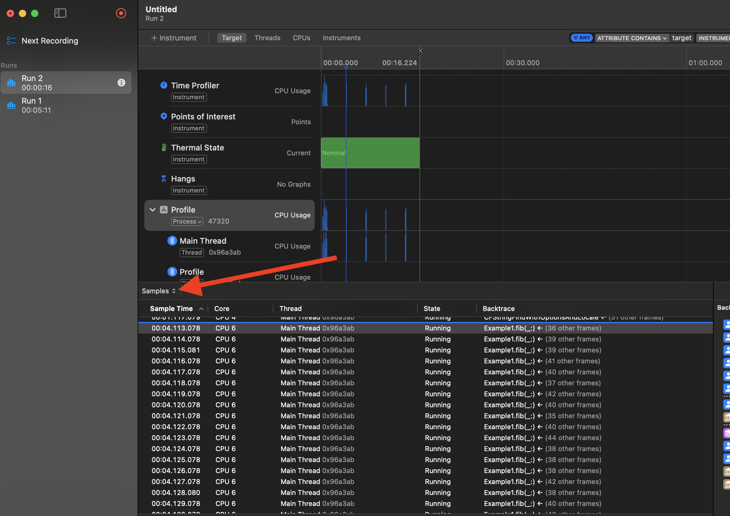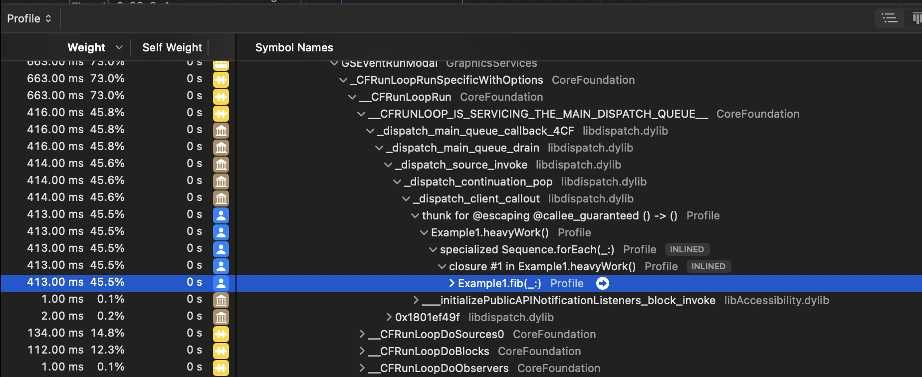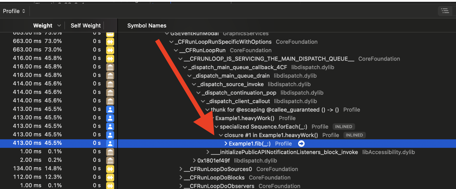 - Example1.heavyWork()가 호출되고나서 forEach 그다음 heavyWork() 그다음 fib() 순서로 파악이 가능하고 마침내 fib()에서 시간이 많이 걸렸다는 의미