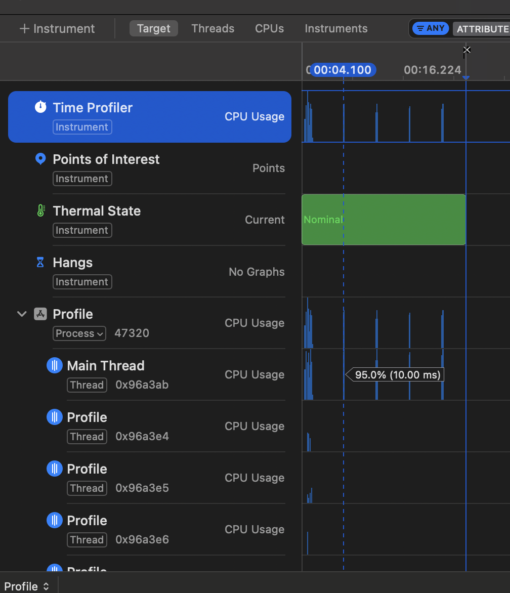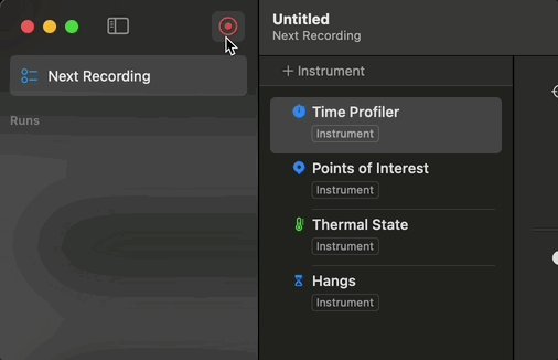 - Xcode > Cmd + I로 Instrument 실행 > Time Profiler 선택