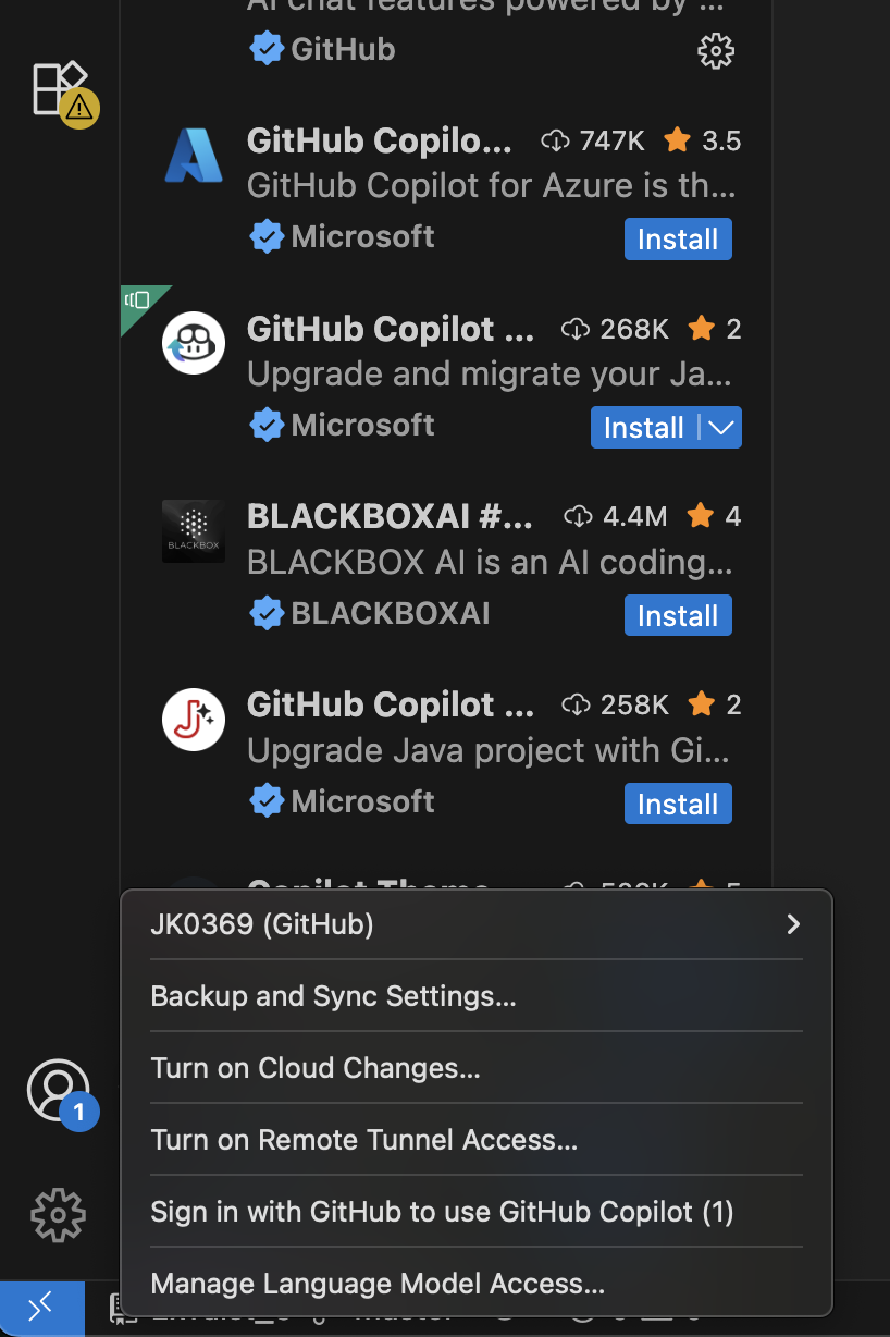- `GitHub Copilot`하나만 설치하면 밑에껏도 자동으로 설치됨
