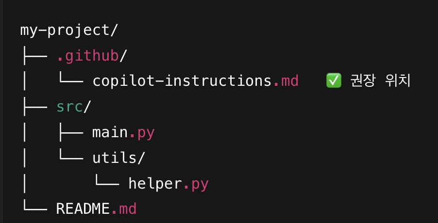- 프로젝트 루트에서 .github 폴더 생성 후 여기에 instructions.md 형태의 이름으로 작성