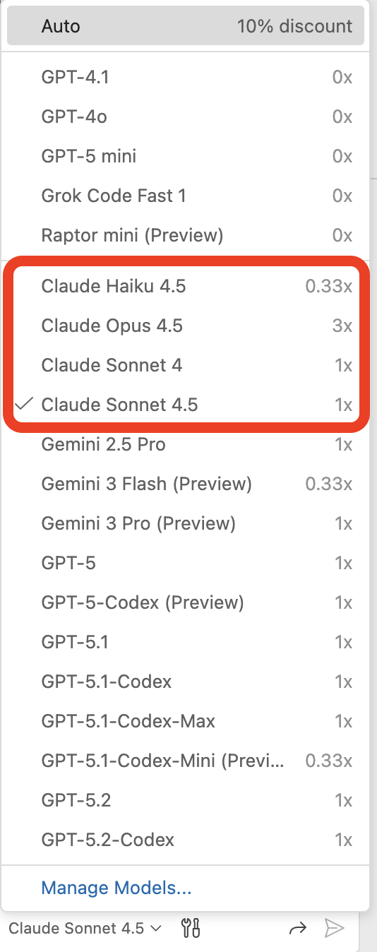 (깃헙 코파일럿에서 고를 수 있는 클로드 코드 모델들)