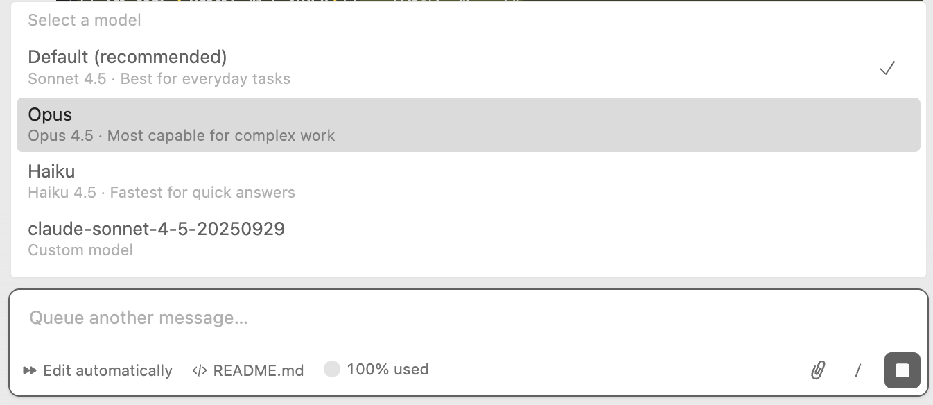 - tip) 복잡한 로직을 물어볼땐 Opus를 사용하고 구현같은 것을 할땐 claude-sonnet-4-5 같은 것 사용 추천