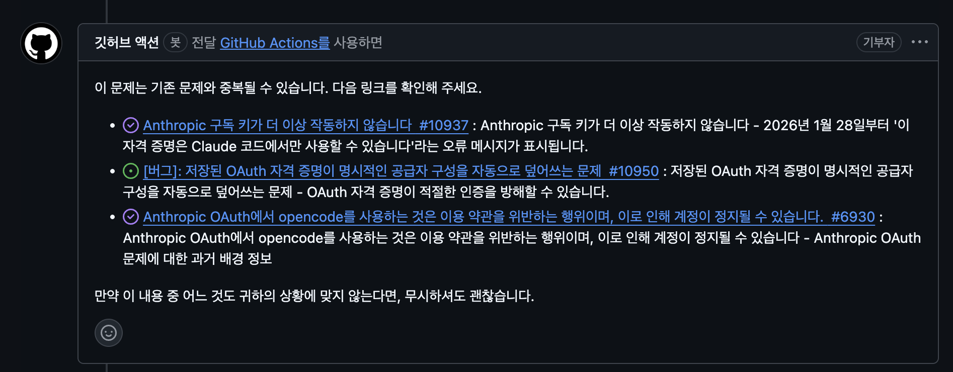 - 오픈코드 레포에 issue로 문의를 해도 github action으로 아래 케이스가 있는지 확인하라는 문의가 있음