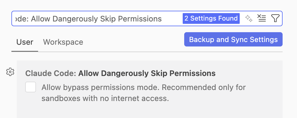 - cmd + ,를 눌러서 `Claude Code: Allow Dangerously Skip Permissions` 검색