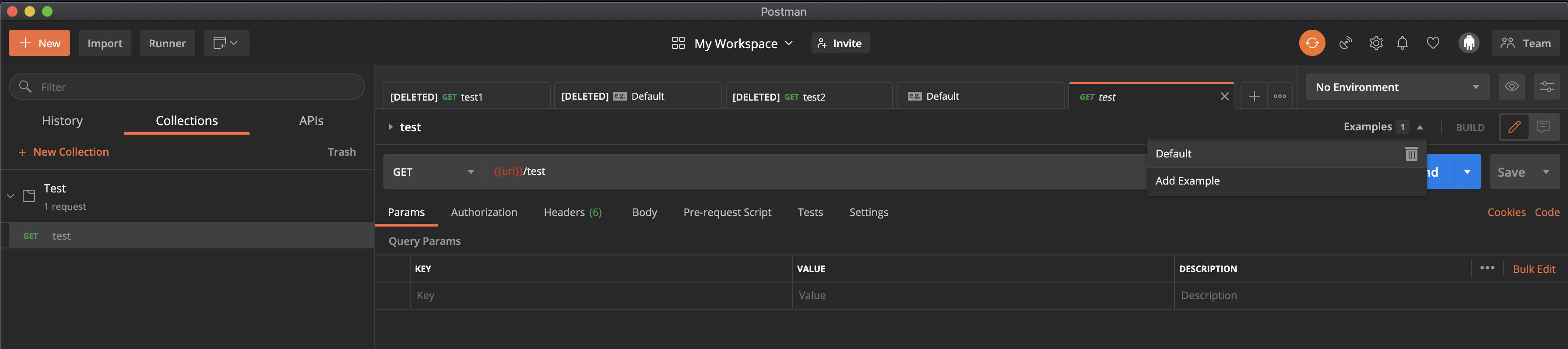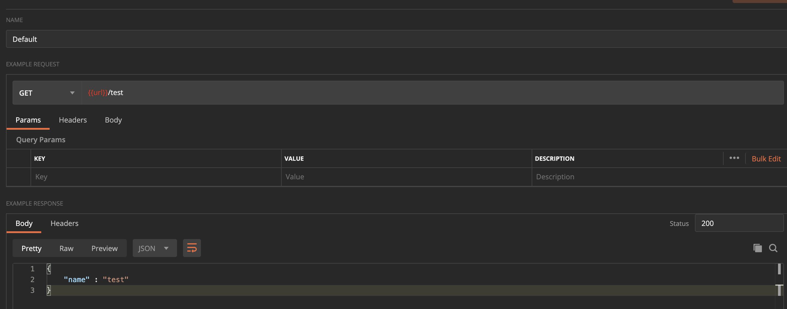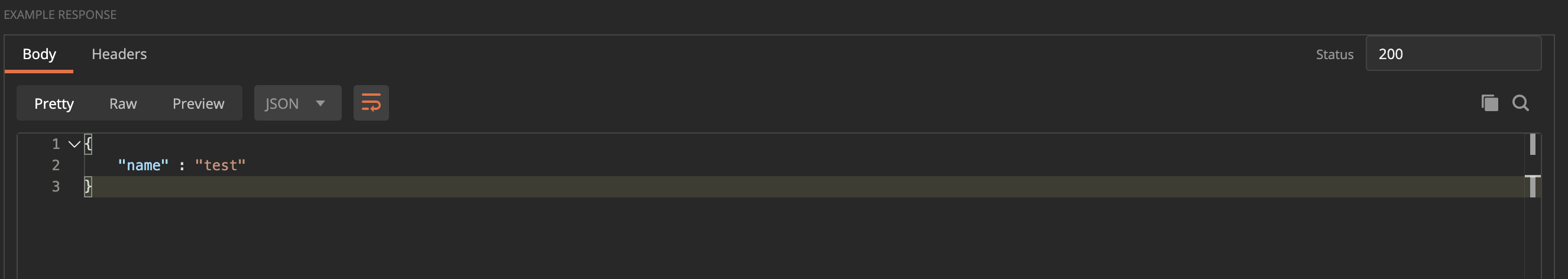 - Response생성: 우측에 "Example" 에서 Default또는 Add Example
