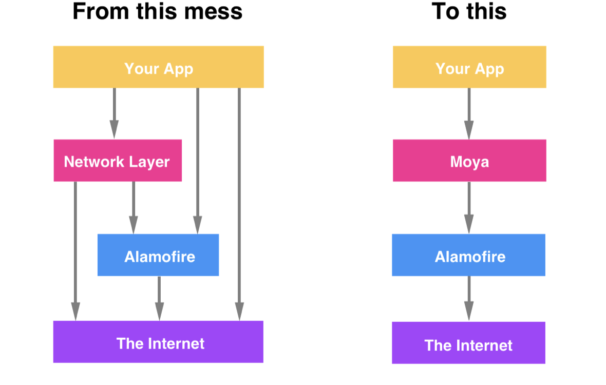 - Moya프레임 워크를 사용하면 Moya에서 Network layer를 템플릿화 해놓고 사용하는 입장인 App에서는 request, response만 처리하면 됨