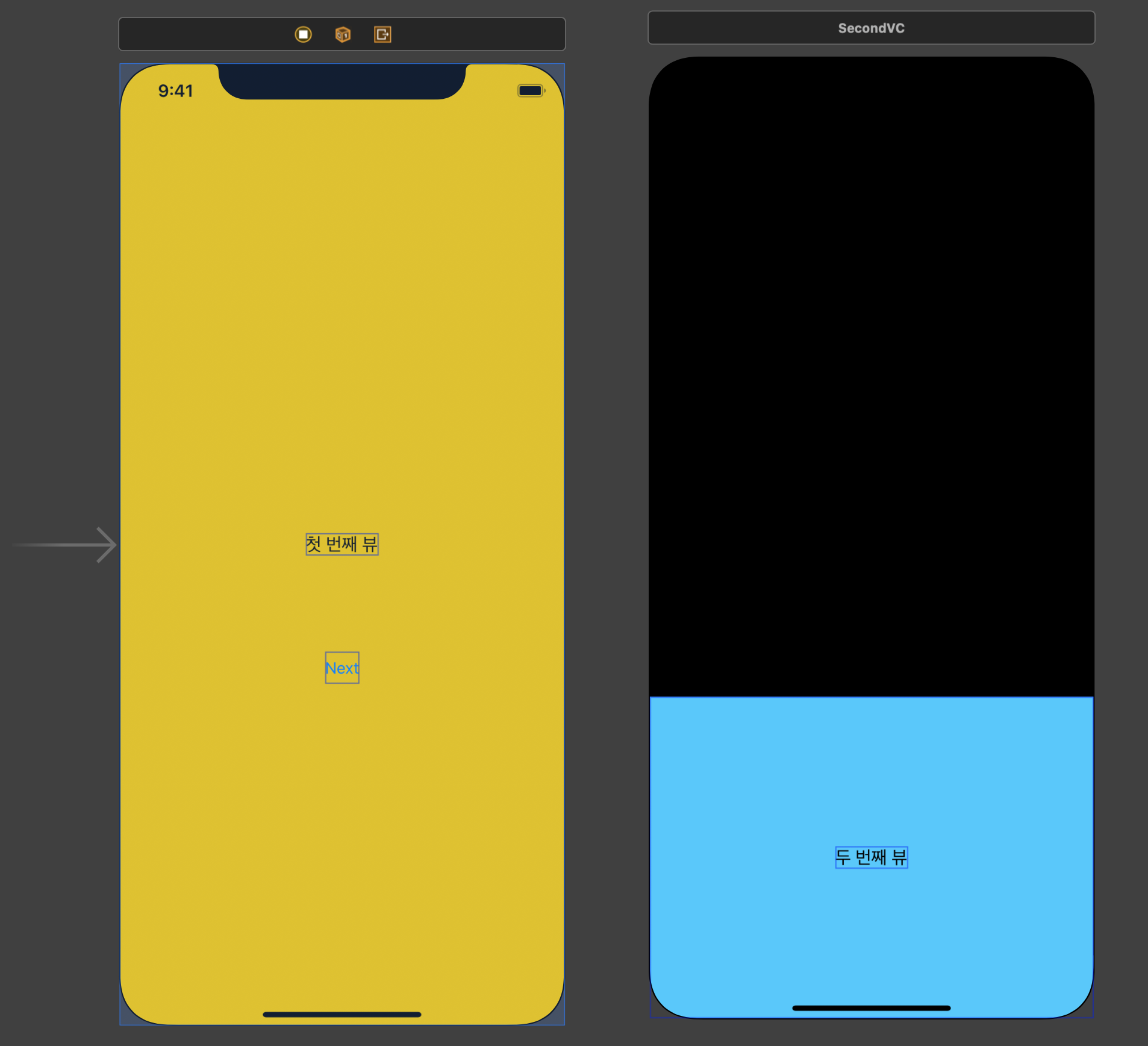 - 전체 화면 덮는 경우: modalPresenationStyle = .fullScreen현재 뷰에 대응하여 새로운 뷰를 보여주는 방식: