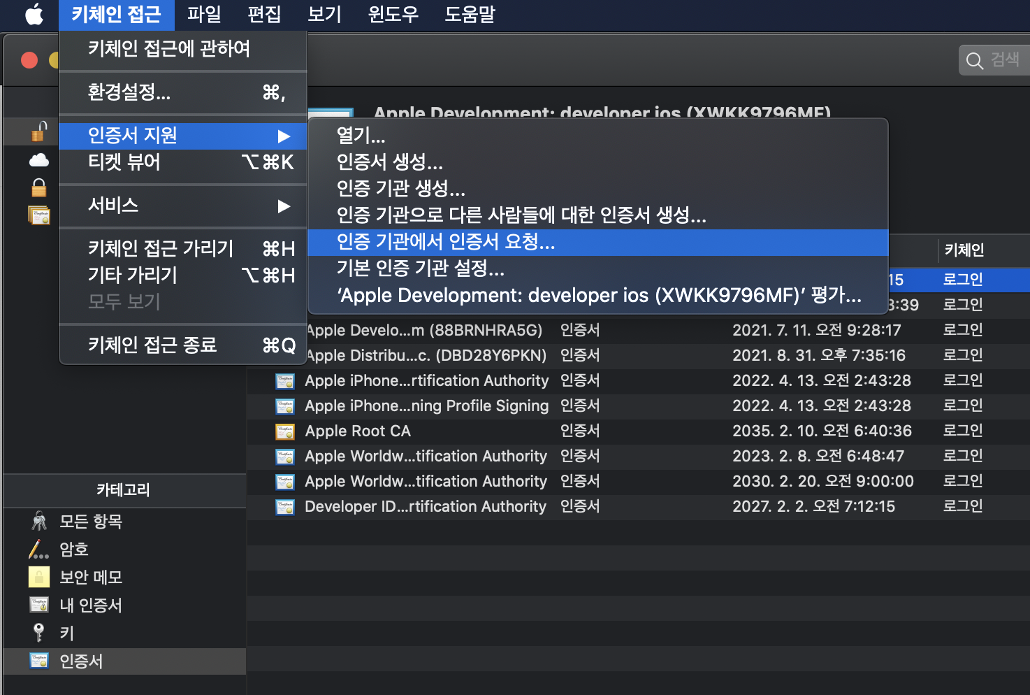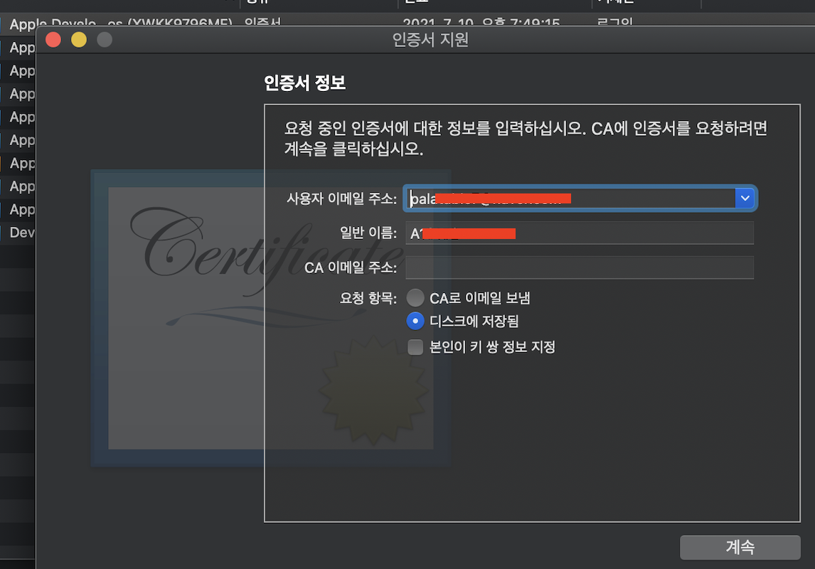 - 인증서 생성: 키체인 접근 -> 인증서지원 -> 인증 기관에서 인증서 요청
