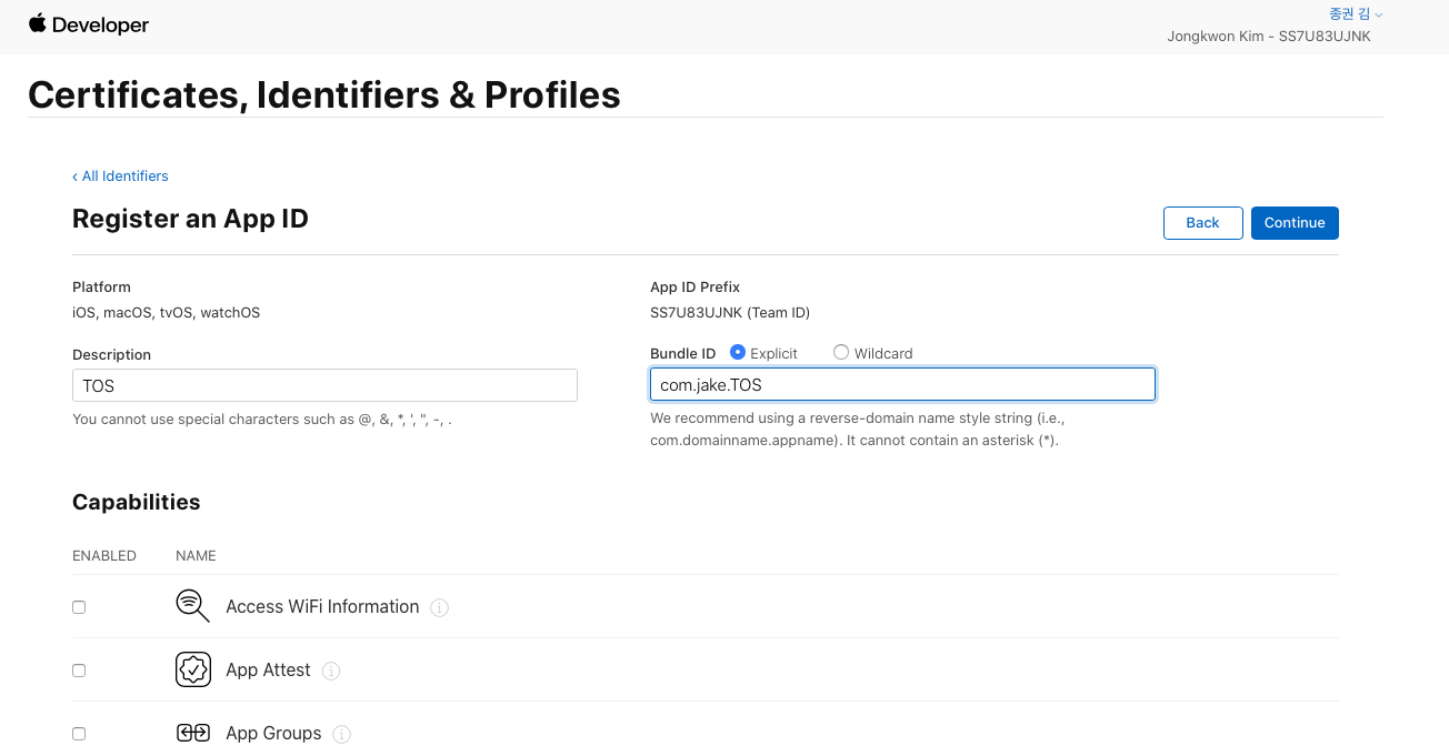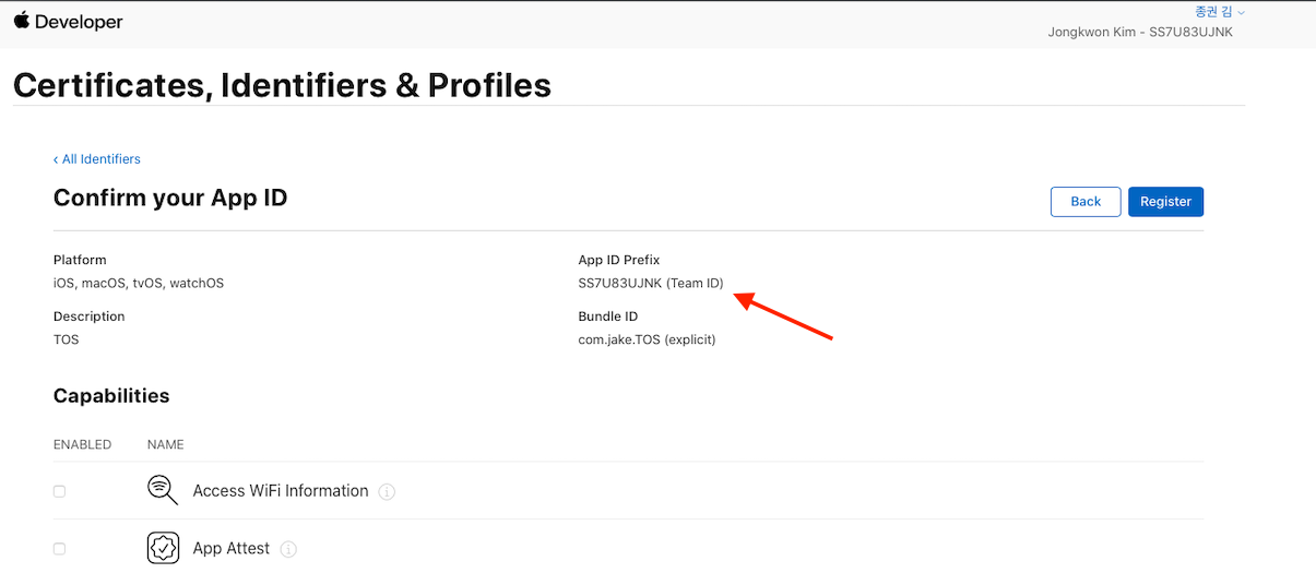 - Continue시 App ID Prefix (Team ID)가 생김