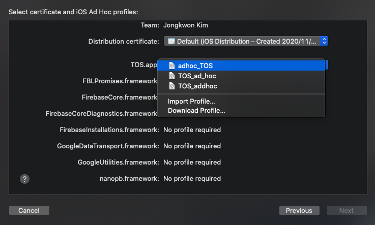 - Provisioning Profile로 인해서 Certificate정보와, 앱스토에 등록한 Provisioning Profile정보를 선택 가능