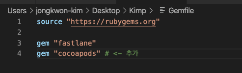 - Gemfile에 cocoapods 추가: bundler는 gemfile을 보고 실행하기 때문에 gemfile cocoapods에 종속성 추가하는 것