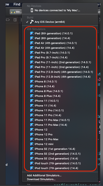 - 주의2: simulator가 선택되어 있으면 x