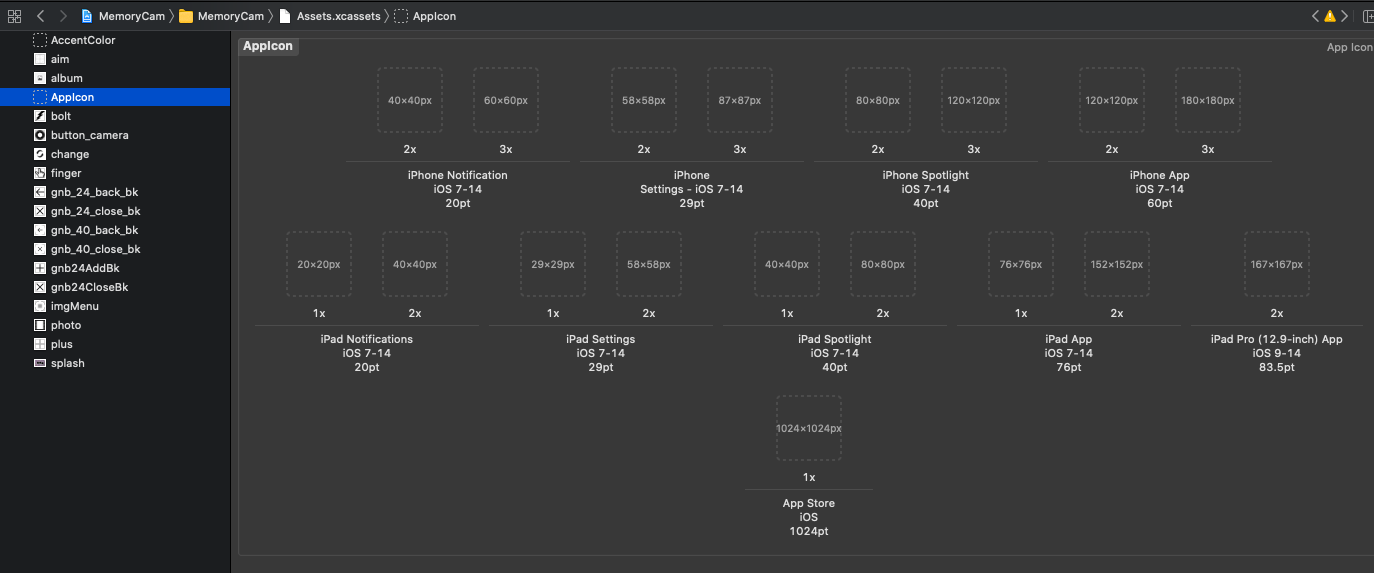 - 이미지 아이콘을 모두 삽입: Phase별로 다른 아이콘 사용 시, app_icon_alpha, app_icon_appstore와 같이 여러개 만든다음 이미지 삽입